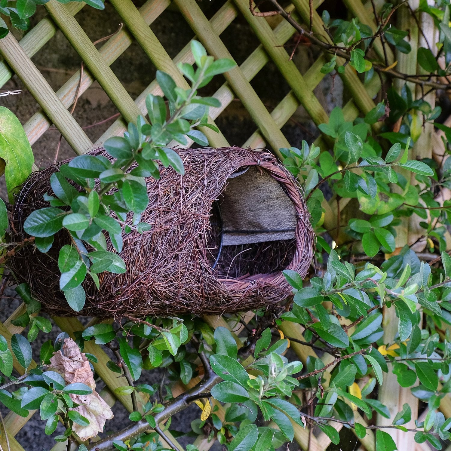 Robins love to nest in sheds with 24/7 access or porches or on shelves in outbuildings. The nester is lightweight and is wired into a hedge or ivy or attached to a wall using the supplied spare loop of fixing wire. The brushwood nester base has a rattan landing platform with a low dividing wall separating the nesting or roosting space.